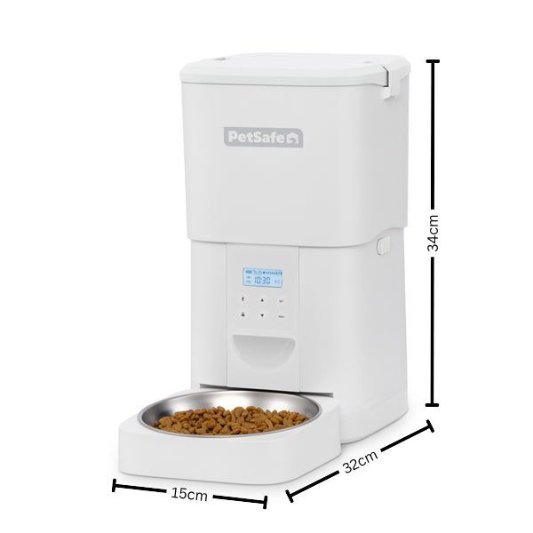 Maintenance is straightforward, with a removable stainless steel bowl that is dishwasher-safe and designed to minimise bacteria build-up. The feeder is compatible with standard dry kibble (approximately 5–12mm), ensuring smooth and consistent dispensing.